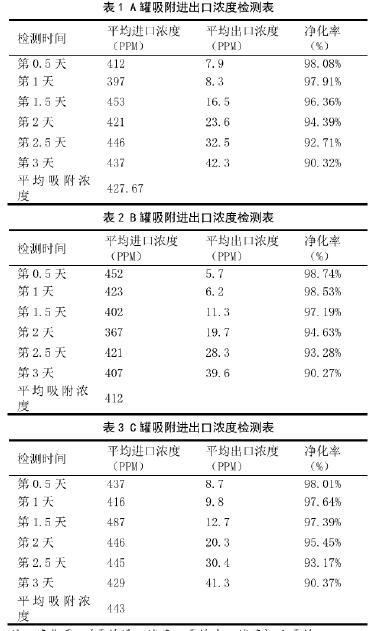 从表1、表2及表3的数据可以看出,在大致相同的平均进口浓度和流速下,经蒸汽脱附再生后的炭床净化率均保持在90%以上,炭床吸附三天后,出口浓度均小于排放标准限值(50mg/m3),切换进入脱附再生阶段,另一再生后炭床切换进入吸附阶段,保证设施的连续运转的同时确保尾气达标排放。